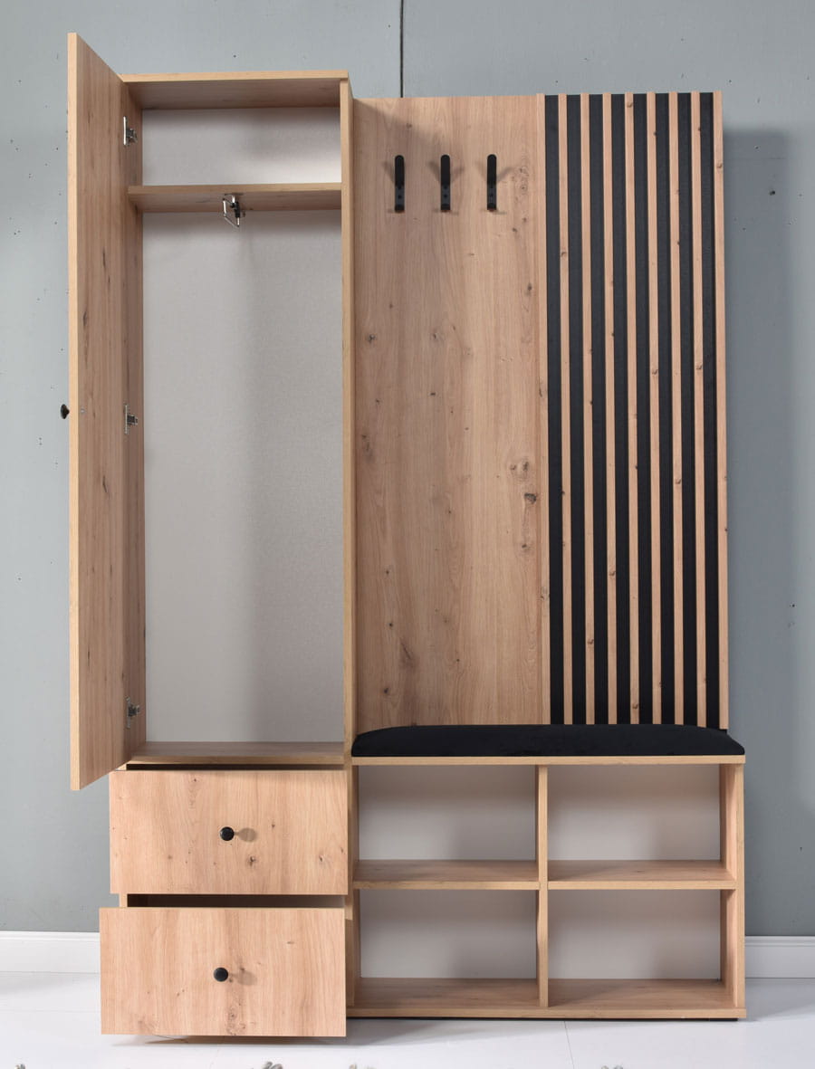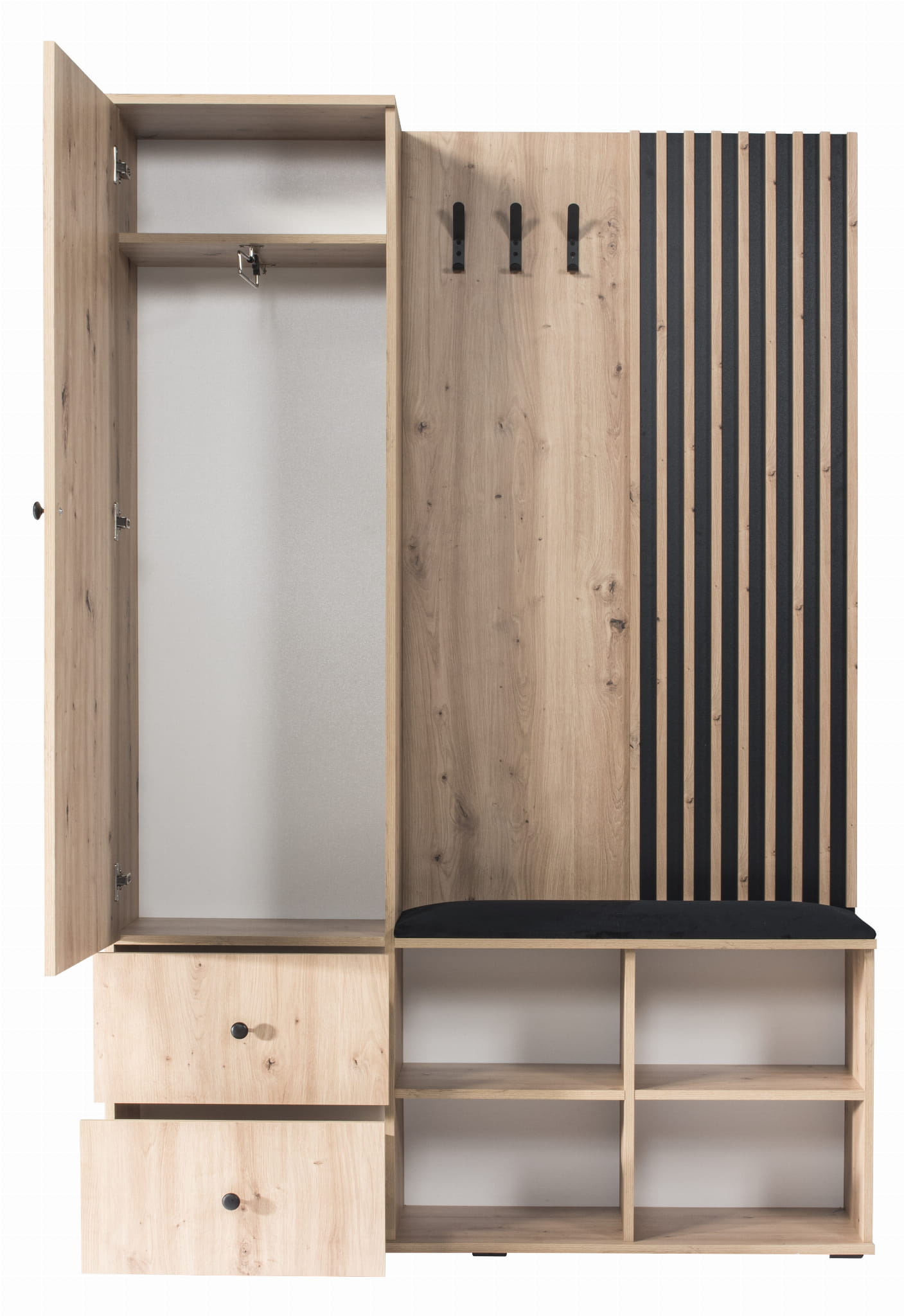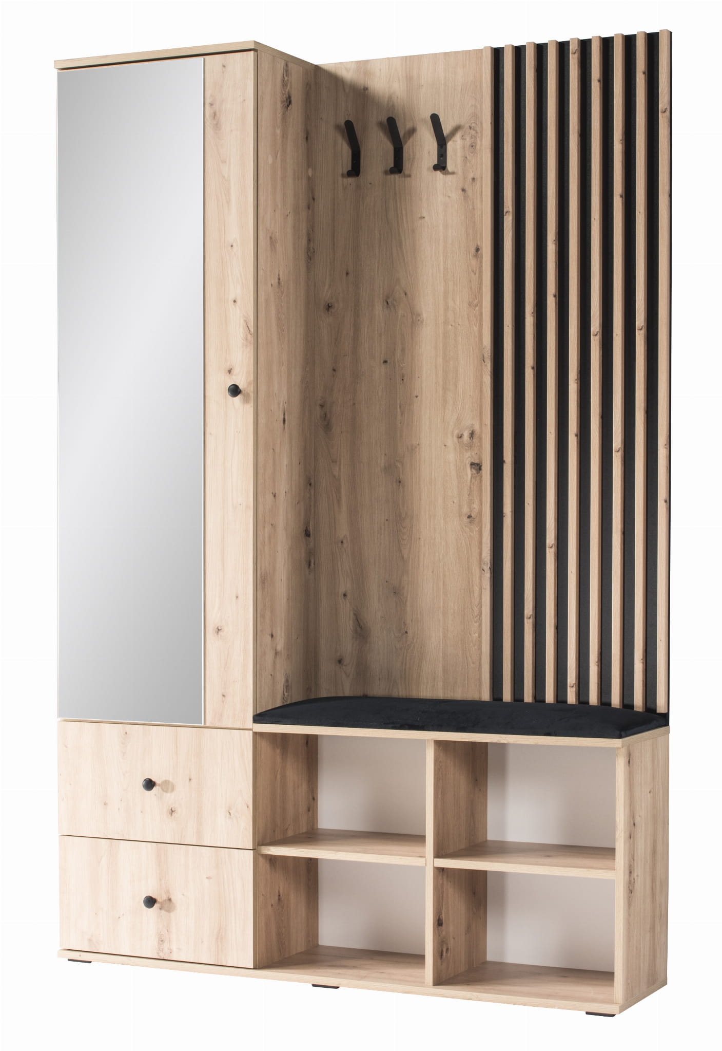 Nowoczesna garderoba z lustrem w jasnym kolorze Artisan do przedpokoju. Idealne połączenie z naszą nową kolekcją CALI, gdzie wchodząc do mieszkania mamy przedsmak nowoczesnego stylu z wykorzystaniem lameli, idąc dalej, do salonu możemy przedłużyć tym samym stylem wystrój naszego wnętrza. Mebel jest niesamowicie funkcjonalny, ma wygodne półki na buty, dwie szuflady w których możemy schować podręczne rzeczy takie jak czapki, czy rękawiczki. Nad szafkami znajduje się obszerna szafa do wieszania ubrań. Garderoba ma wygodne, tapicerowane siedzisko w czarnym kolorze, które pasuje do tła na których są lamele. Swoje kurtki czy płaszcze możemy powiesić na trzech, metalowych wieszakach, które są tak skonstruowane, ze możemy powiesić na nich aż sześć ubrań, każdy na osobnym wieszaku! Ta garderoba to idealne rozwiązanie do wiatrołapu.